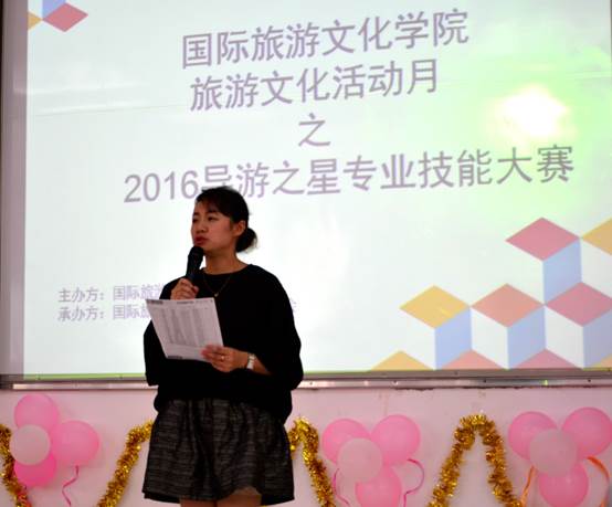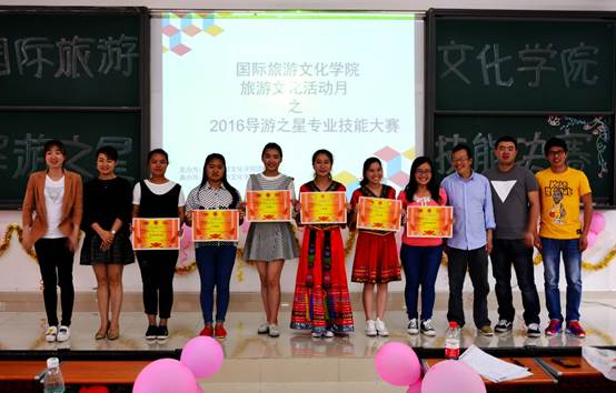 本次比赛共有两个环节:少数民族风俗讲解和贵州旅游路线讲解,并有由赛前发起的微信公众号投票决出最佳人气奖。经过激烈角逐,2014级旅游英语班获得一等奖及最佳人气奖、2015级旅游管理班获得二等奖、2014级旅游管理班获得三等奖。最后,李楠老师对本次比赛中各支队伍的表现进行了专业指导和点评,龙婧老师也对本次大赛的成功举行给予高度肯定。