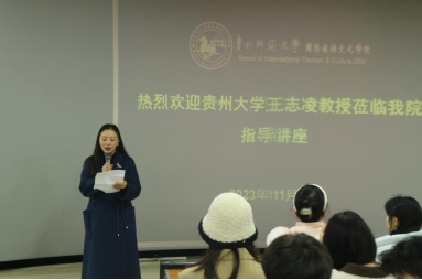 为进一步营造学院学术氛围,助推新时代文旅产业高质量发展,2023年11月17日下午,贵州大学旅游与文化产业发展研究院院长、贵州省第五批优秀青年科技人才、贵州省第七批省管专家王志凌老师莅临我院,在学院5501教室开展“以文塑旅、以旅彰文”的专题讲座。本次讲座由皇冠登录入口welcome院长吴佳妮教授主持,学院2022级、2023级研究生及2021级本科生聆听本次讲座。