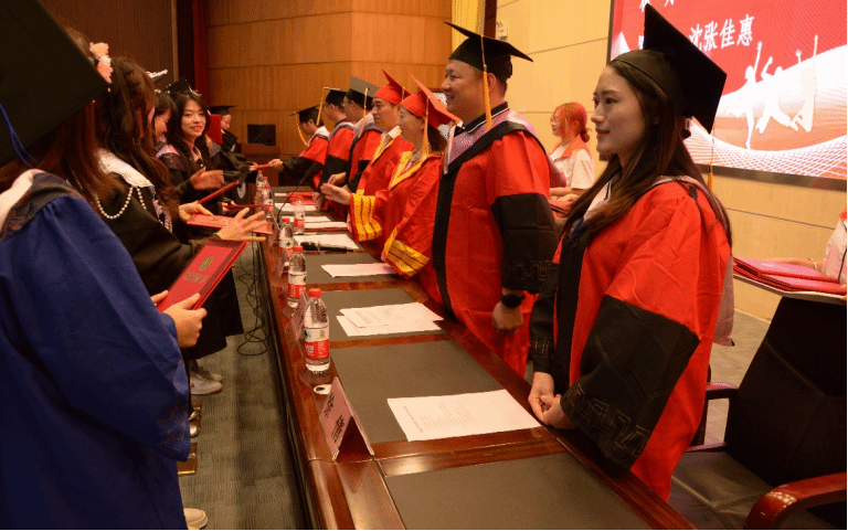 典礼上,主席台就座的领导和老师为获得学位的毕业生颁授卷轴并援正流苏。