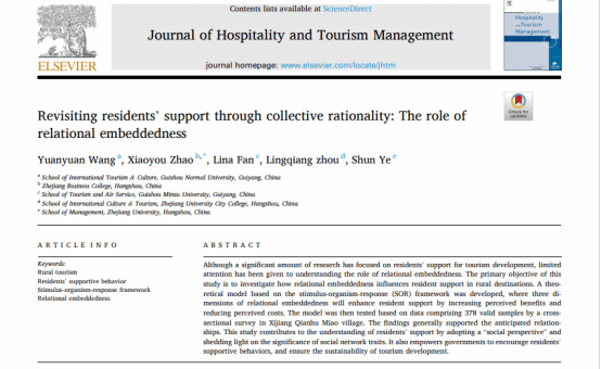 近日,由我院王媛媛副教授携团队成员共同完成的研究成果《Revisiting residents’ support through collective rationality: The role of relational embeddedness 》被旅游管理学科SSCI1区期刊《Journal of Hospitality and Tourism Management》接收并发表。