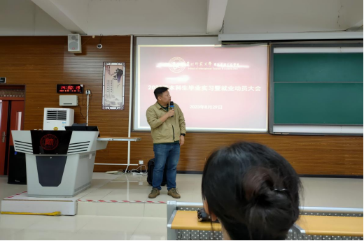 其次,陈明就学生实习安全和就业动员发言,提出三个方面的要求。第一是“纪律”,学生要严格执行实习要求、遵守实习单位纪律,同时作为在校生同样要遵守校规校纪。第二是“安全”,陈明指出要将生命财产安全放在首位,个人的人身安全尤为重要。要注意防范高薪诈局,及时和家里及实习指导老师沟通,注意交通安全。在实习过程中时刻保持清醒头脑,注意自身安全。第三是“就业”,陈明对目前的就业形势进行分析,鼓励2024届毕业生考研、应征入伍等。