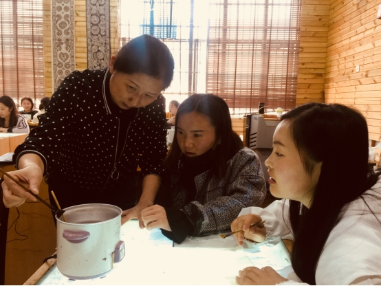 2019年5月10日下午,贵州蜡染兴趣小组由学院党委书记胡娅丽主持开班,胡书记以蜡染的传统文化为切入点,对贵州苗族蜡染进行系统说明;学院党委副书记陈明表示基地的建立为同学们的优秀作品组建提供了产品展示平台,鼓励学生学习蜡染传承的精湛技艺,并寄予同学们深切的期望。基地负责人吴晓秋老师表示,后期将在这个兴趣班上挑选十名优秀学生作为领头人带领大家把兴趣小组发展成为学院的一大亮点。在课上,吴晓秋、马静、陈玥锟等老师对四十多名学生进行指导,吴晓秋老师为同学们讲解了蜡刀的使用技巧及怎样掌握画蜡的温度,为同学们示范画蜡的手法。