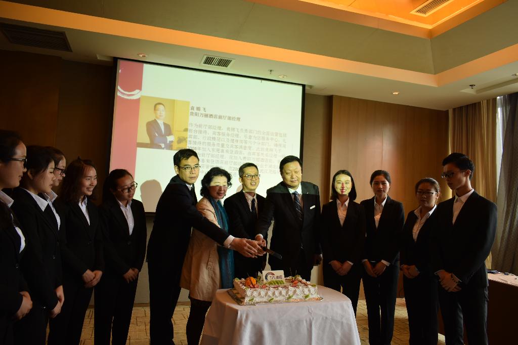 首先参观考察的是金阳新区万丽酒店。该酒店为我院的实习实践基地,双方建立了长期稳定的校企合作关系,并在“万豪基金中国旅游教育合作项目——万礼豪程”上取得了显著的教育成效。万丽酒店总经理、前厅经理相继作了欢迎辞并发表讲话,学院副院长林坤也代表学院表达了对万丽酒店接待参观事宜的感谢及对双方加强合作的期待。随后,在学院师生及万丽酒店代表的见证下,双方举行了切蛋糕仪式。仪式结束后,万丽酒店的两位主管带领师生一行参观了员工宿舍、酒店大堂、餐厅、会议厅、客房等并一一作了详细介绍,研究生们也对酒店管理等方面的问题进行了咨询和记录。